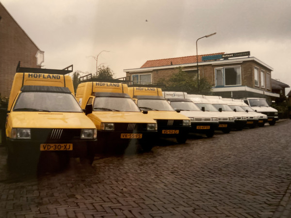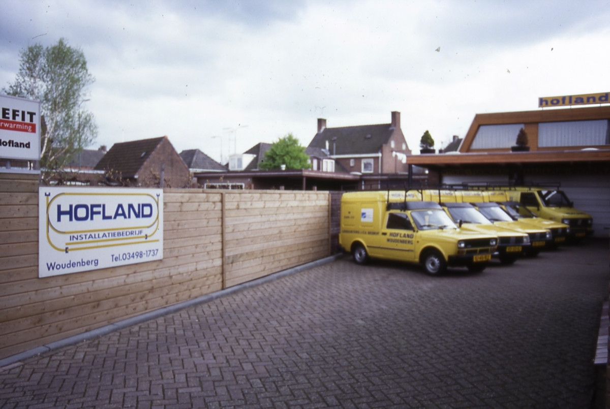 In de oude werkplaats werd een doe-het-zelf-winkel ingericht die door Dicky Hofland werd gerund (foto 2). Begin jaren ’80 kwam Jan Hofland als derde generatie de werkvloer op als monteur. In deze tijd was er de ontwikkeling van gaswandketels naar hoog-rendement ketels. Kenmerkend in die jaren waren de gele bedrijfsauto’s van Hofland (foto 1). De eerste installaties die met kunststof buis werden gemaakt. Hier werd de basis gelegd voor de ontwikkelingen van Hofland voor de komende decennia.