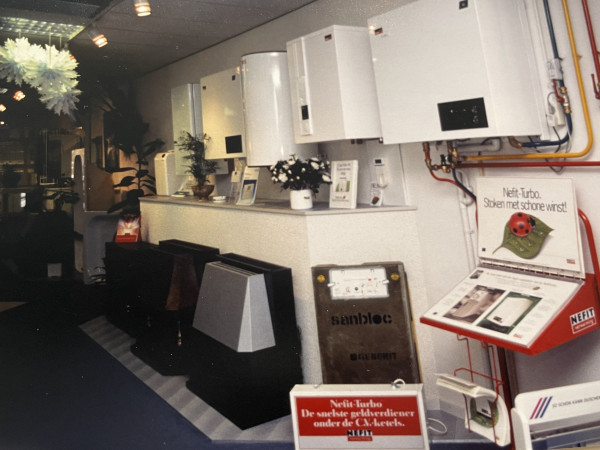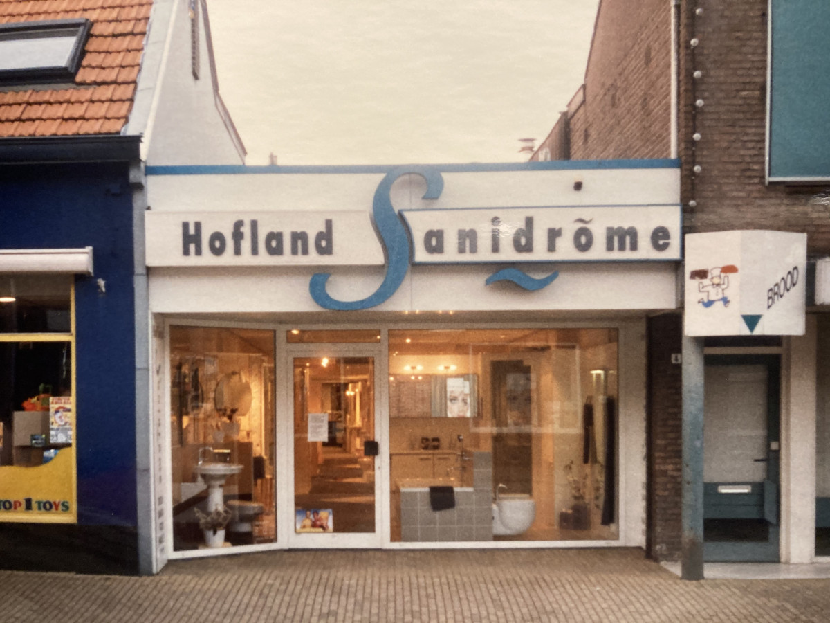 In de jaren ’90 heeft Hofland het pand naar de Voorstraat gekocht. Hierin werd een luxe sanitair showroom van gemaakt, toen ook nog met gaskachels, cv-ketels een uitgebreidere doe-het-zelf afdeling (foto 2 en 3). Jan Hofland ging de verkoop doen en zijn vrouw Ellen Hofland kwam op kantoor voor de financiële administratie (foto 4).