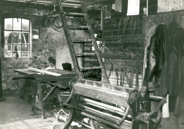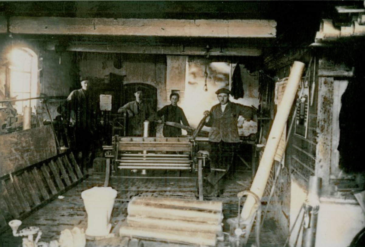 De oorlogsjaren waren een moeilijke tijd. Desondanks kon Jan zijn werk doorzetten en werkte inmiddels met vaste kameraden. Er was een eigen werkplaats. Jan staat rechts op de foto.