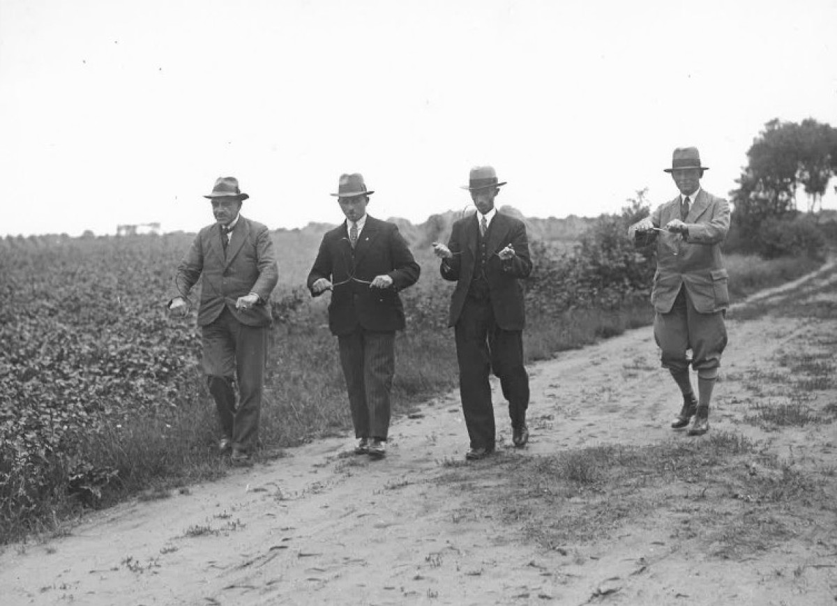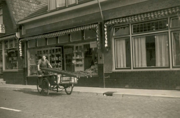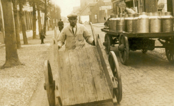 In de jaren ’30 werd de volgende generatie geboren: Henk Hofland. Op de eerste foto staat Jan Hofland met de handkar in de Voorstraat. Vervoersmiddel wat in die tijd werd gebruikt. Het instrument wichelroede werd door Jan Hofland (foto 2: 2e van links) gebruikt om waterbronnen op te sporen om zo ondiep mogelijk een drinkwaterbron aan te kunnen leggen.