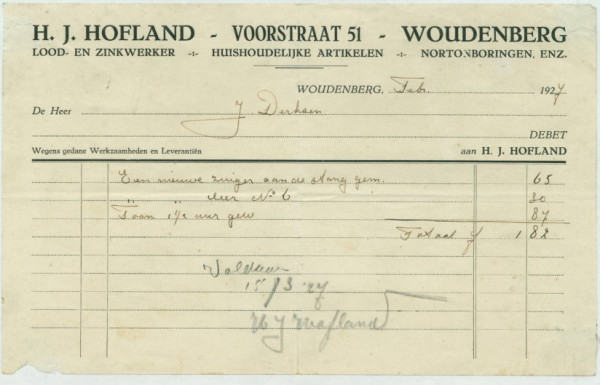 In 1924 is H.J. Hofland opgericht door Jan Hofland in de Voorstraat, Woudenberg. Hij begon als loodgieter, werkte met zink en lood en repareerde daken. Hij werkte aan wasketels en kruiken. Later, rond 1927, opende H.J. Hofland met zijn echtgenote Gijsje Hofland een winkel in de Voorstraat in Woudenberg. Men kon bij hen terecht voor (reparatie aan) huishoudelijke artikelen en het loodgieterswerk van H.J. Hofland.